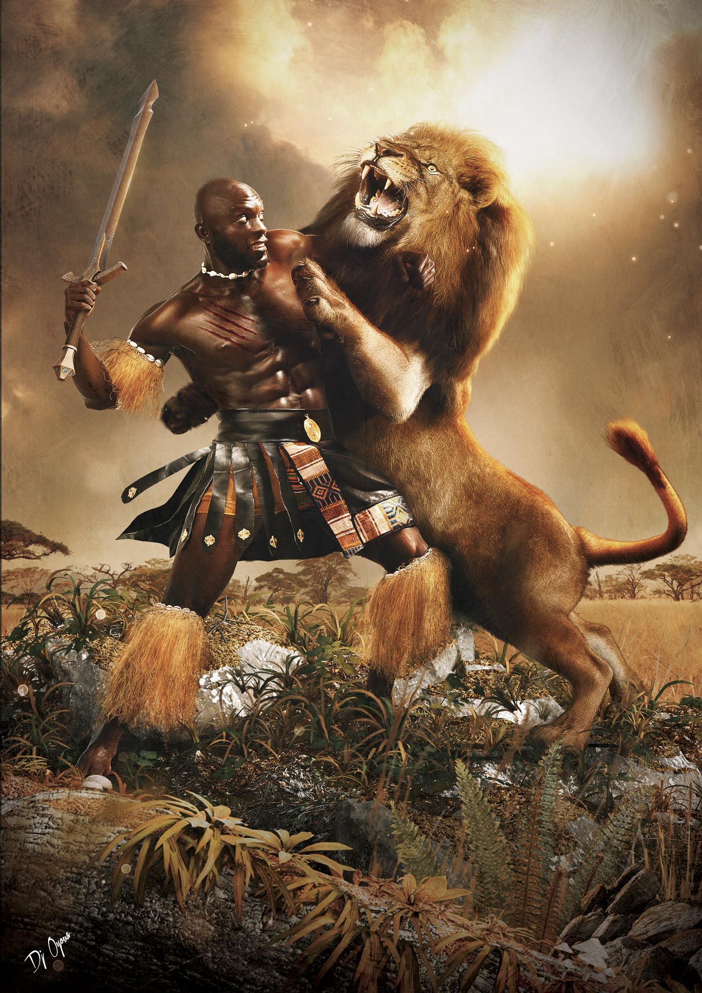 Les combats humain vs lion m'ont toujours fascinés. J'ai donc imaginé cette scène. En plein coeur de l'Afrique, ce jeune guerrier, qui voulait tant faire ses preuves en tant qu'homme et impressionner toute sa tribu, se lance dans une quête sans merci pour tuer un lion mangeur d'hommes.