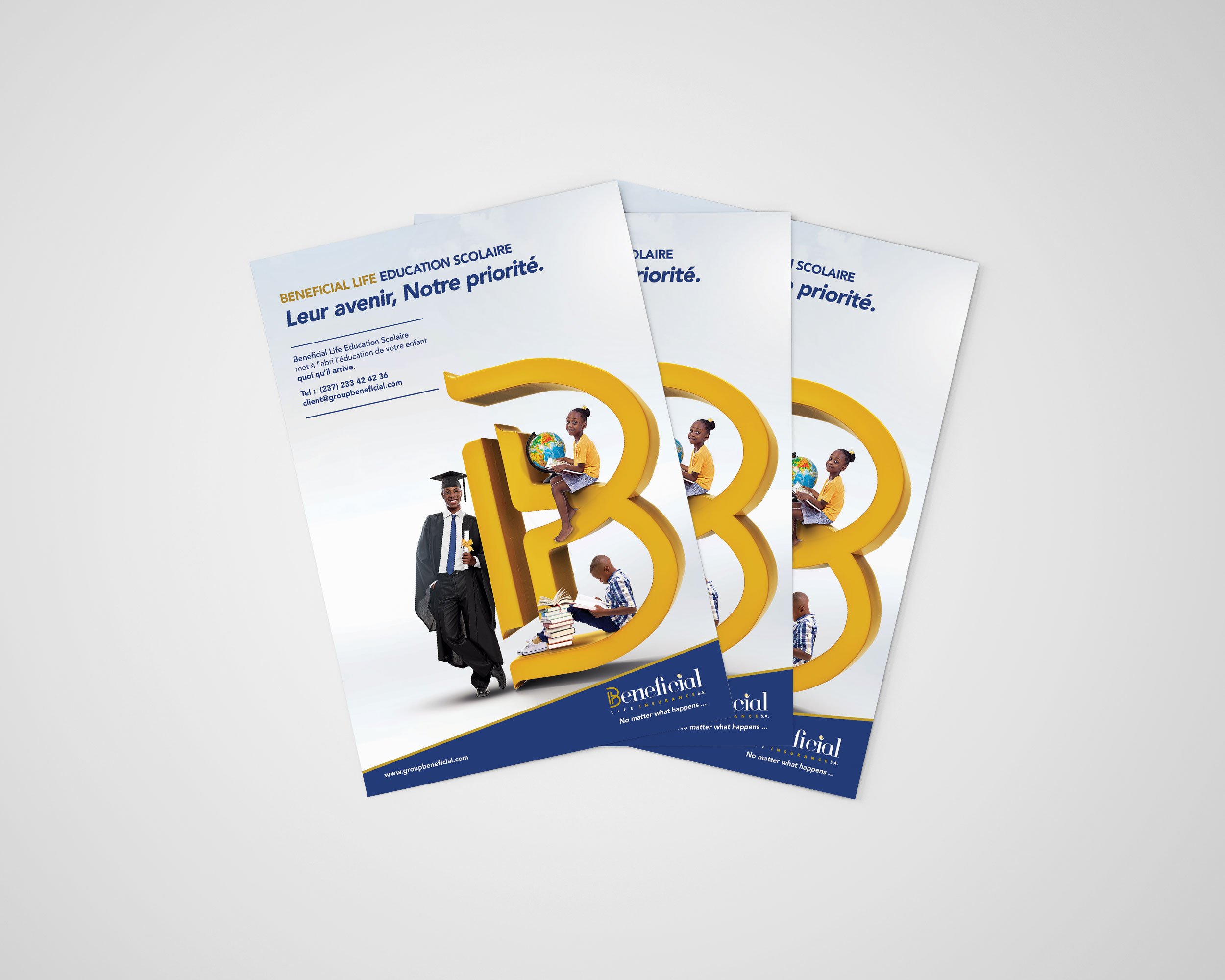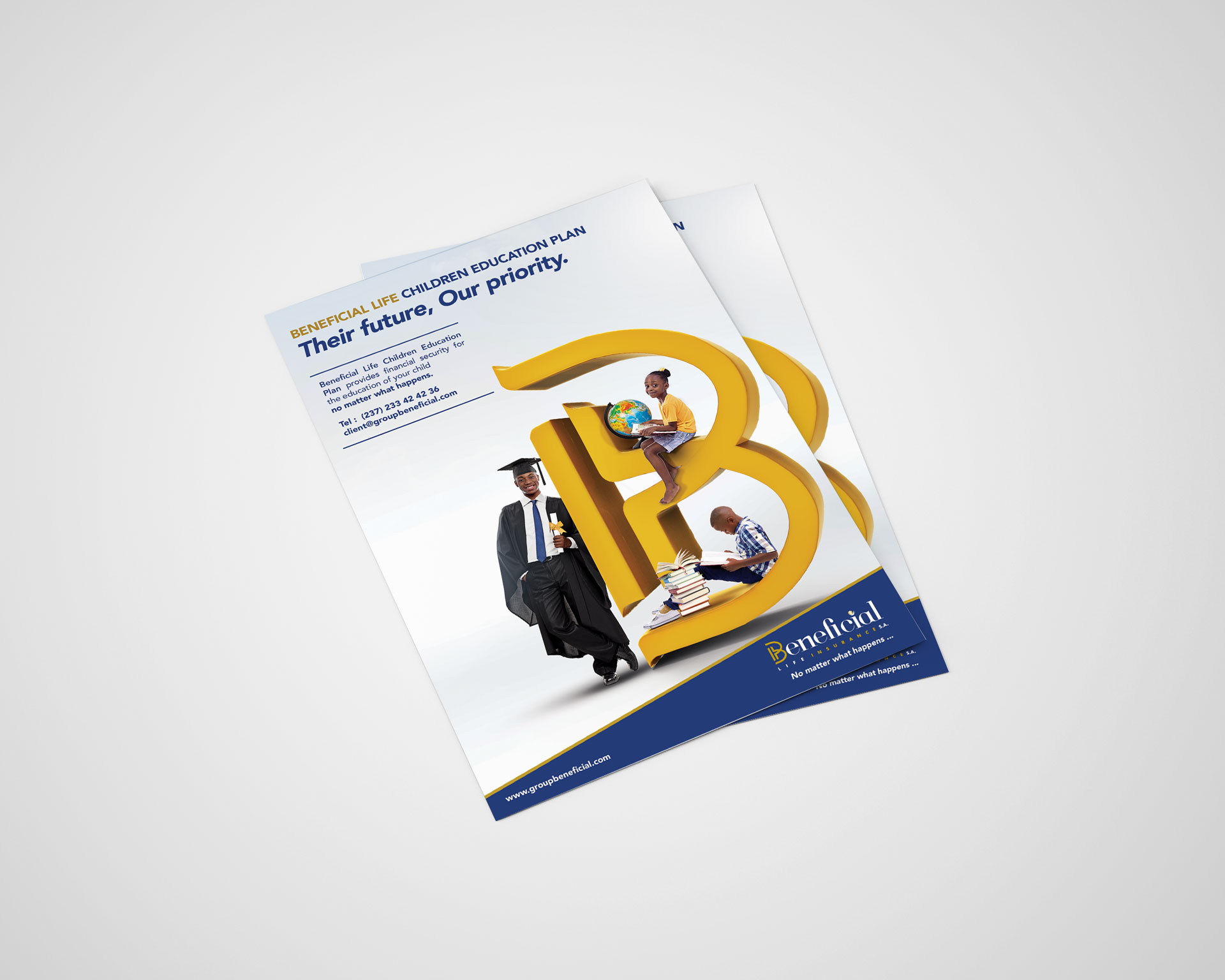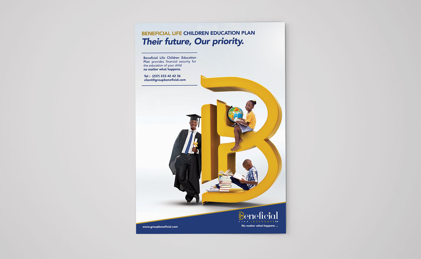 Engagé par Beneficial Life Insurance au Cameroun pour repenser le visuel de l'offre "Education Scolaire", l'un de leurs produits phares. Le concept : " Avec Beneficial Life Child Education Plan, mettez à l'abri le futur vos enfants !"