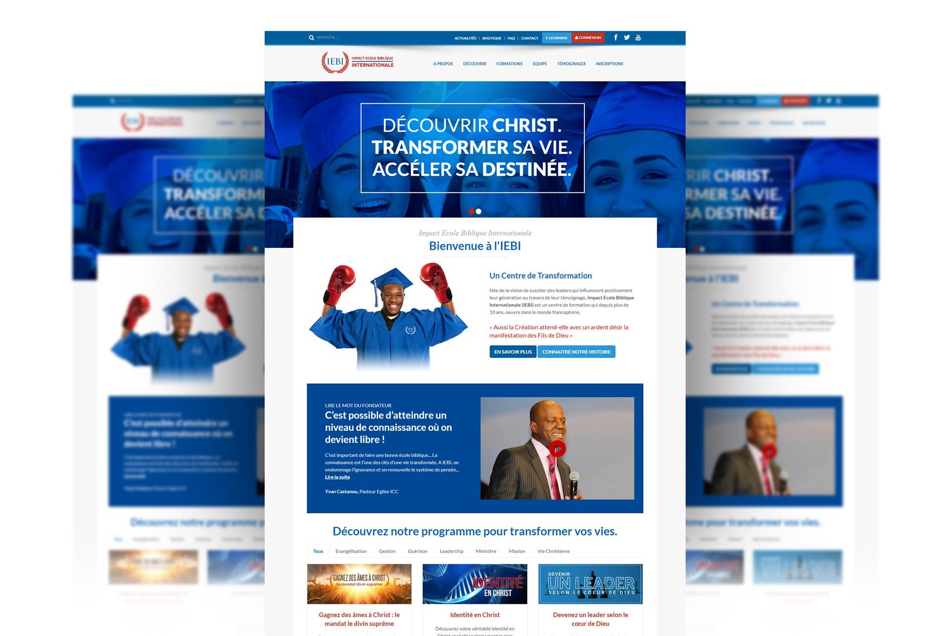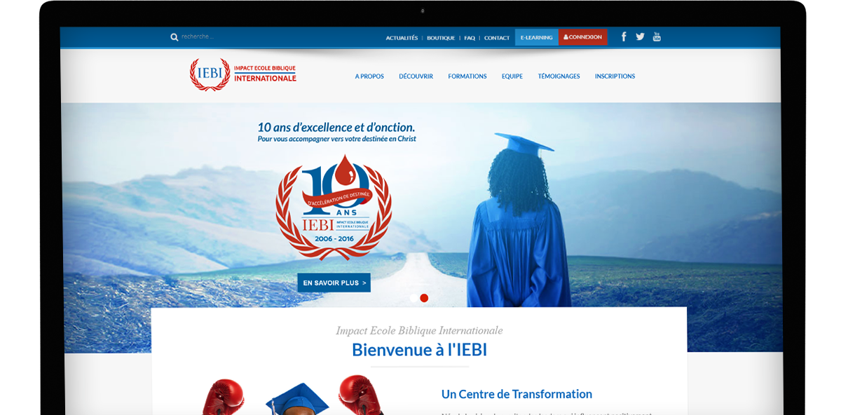 Engagé par l'église ICC (Impact Centre Chretien) à Paris pour la conception et la réalisation du site de l'IEBI (Impact Ecole Biblique Internationale. Ce fut egalement l'ocasion de concevoir le logo de leur 10e anniversaire.